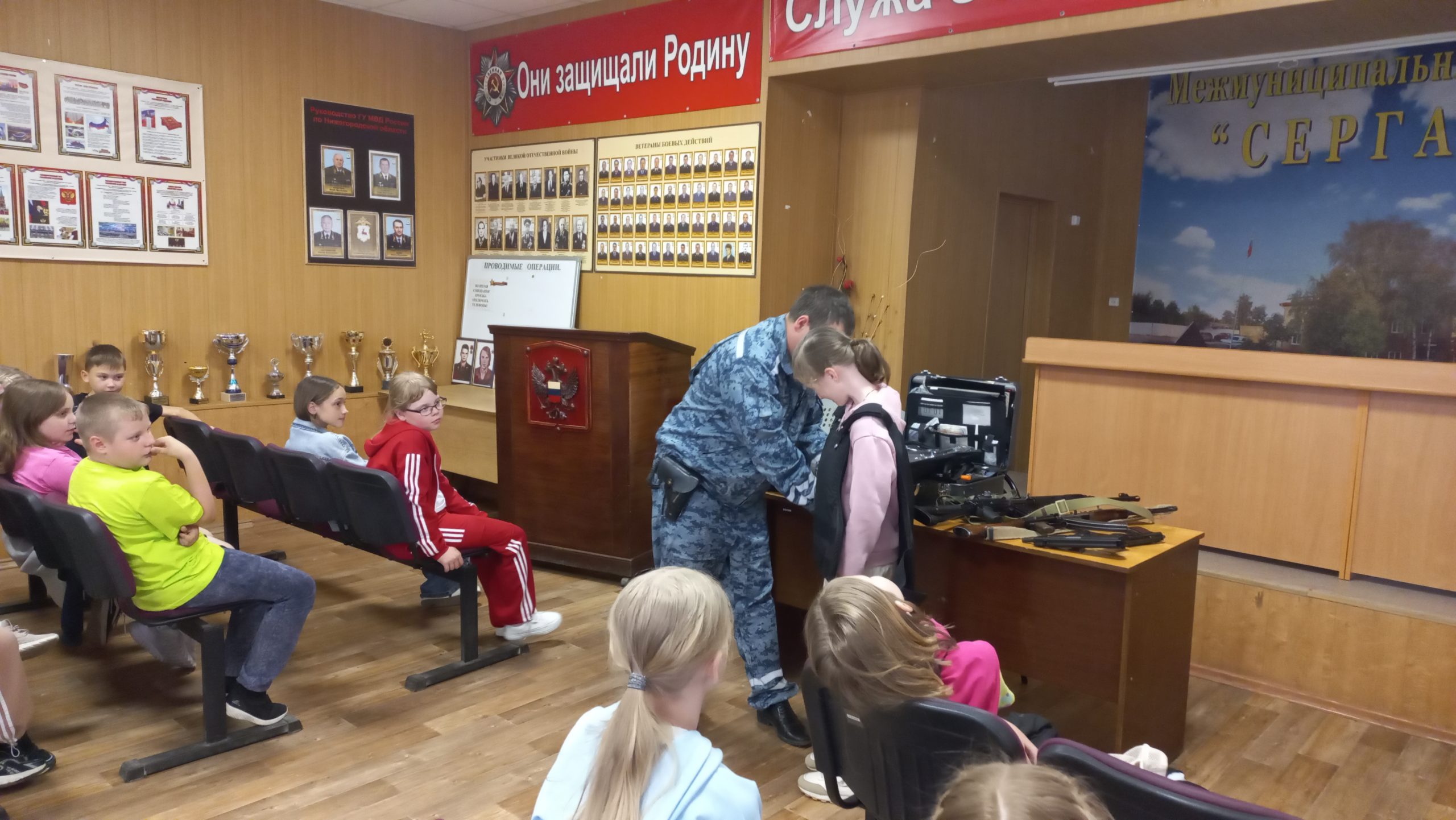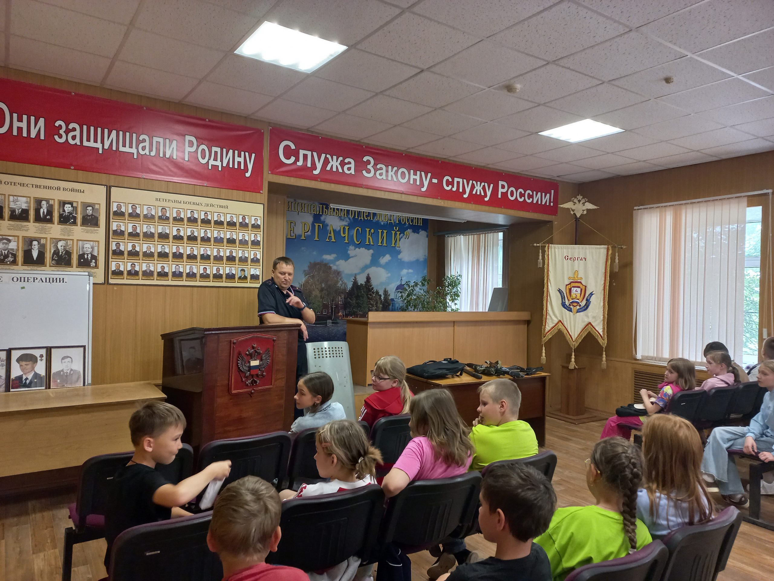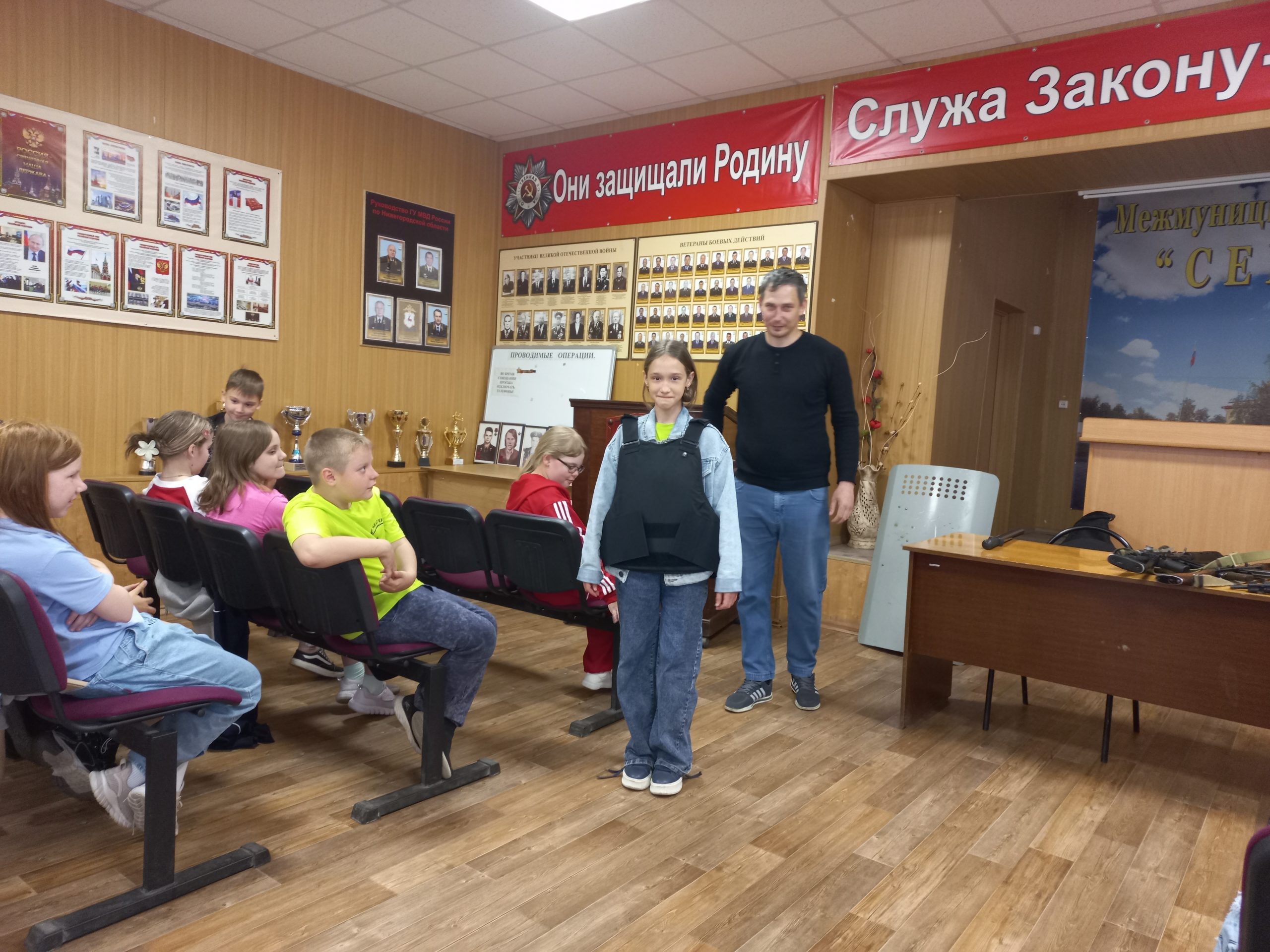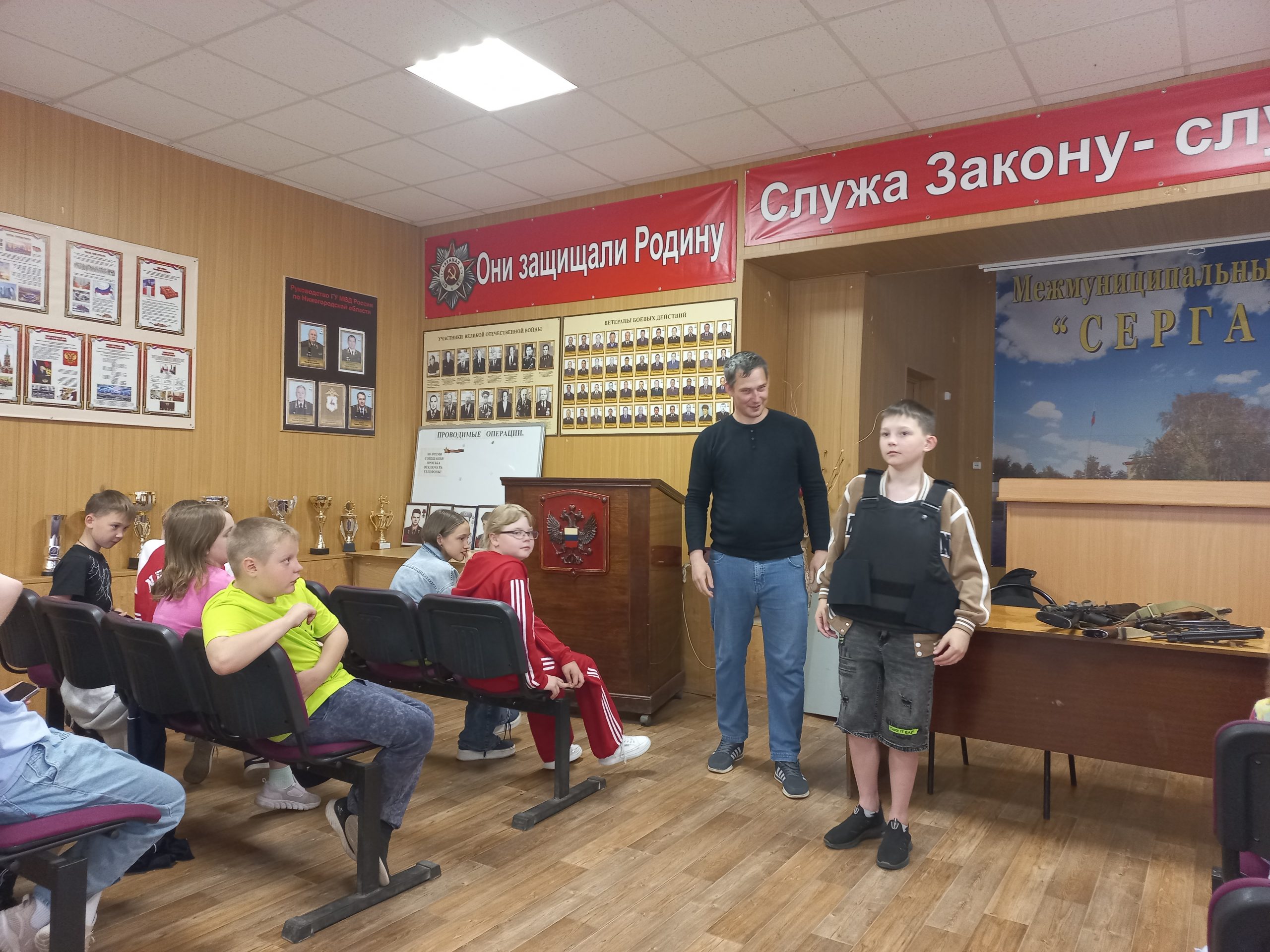 Встреча началась с поздравления ребят с окончанием учебного года и началом каникул. Затем майор полиции Максим Колотухин рассказал о службе экспертов-криминалистов. Показал свой рабочий чемоданчик, продемонстрировал процедуры снятия отпечатков пальцев и распознания следов преступников. Также он рассказал о состоящих на вооружении полиции специальных средствах, оружии и о том, какими навыками должен обладать настоящий полицейский. Юным гостям Максим продемонстрировал некоторые виды оружия и спецсредства, используемые сотрудниками полиции. Все желающие смогли примерить на себя средства защиты и почувствовать себя полицейскими.