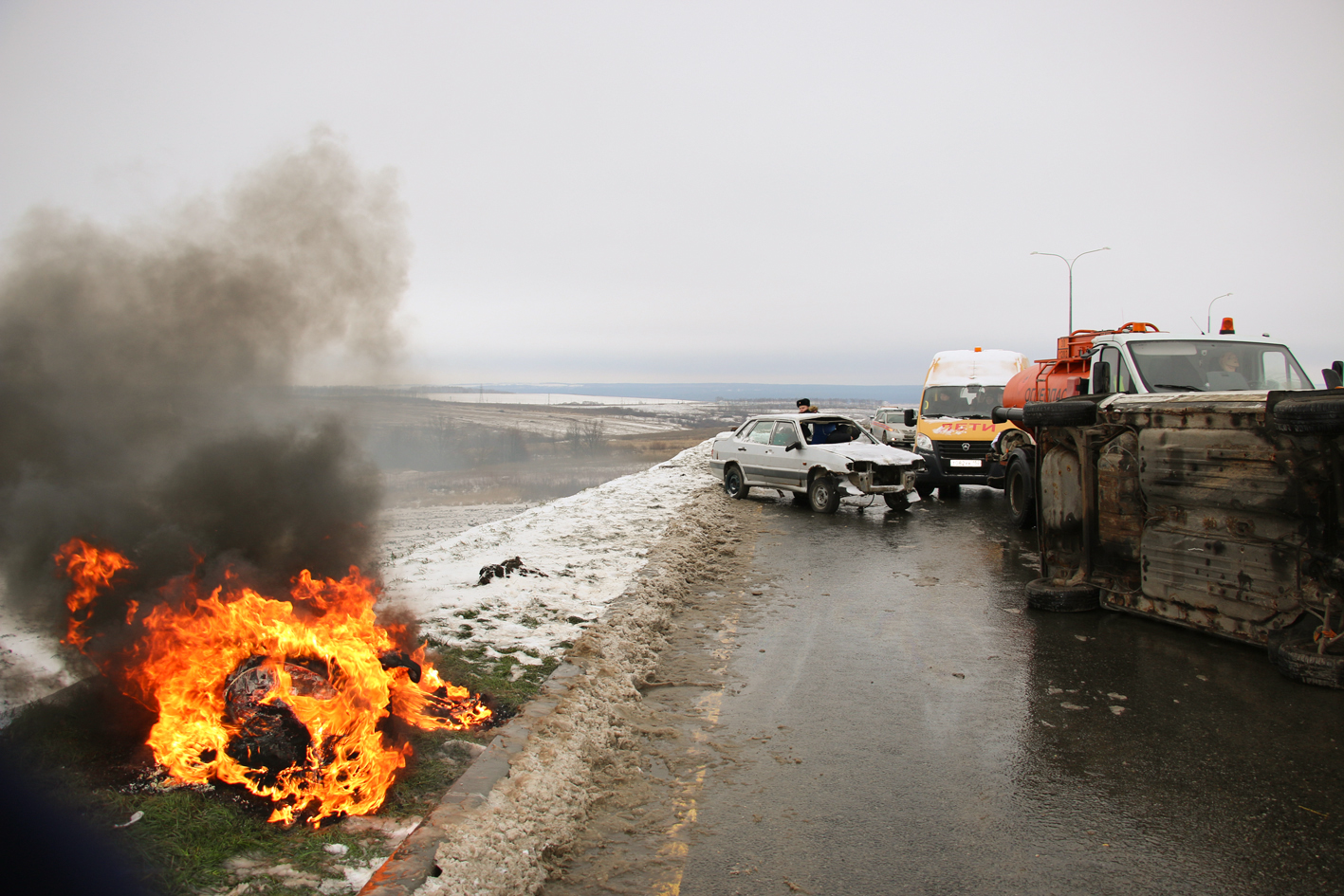 По легенде, на дороге столкнулись легковые машины, автомобиль, перевозящий сжиженный газ, и автобус с детьми. В результате ДТП погибли два человека, ещё несколько пострадали, из-за аварии на трассе образовался серьёзный затор.