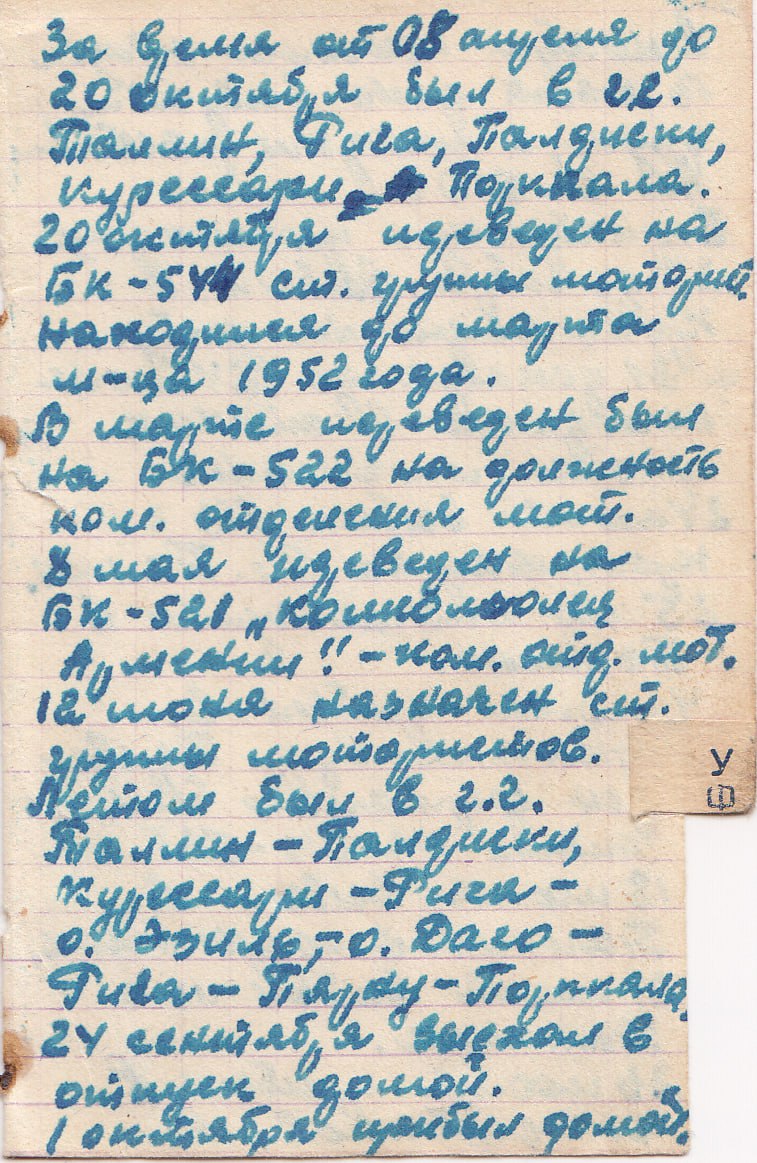 В последующие годы наш земляк совершал множество рейсов между Таллином, Ригой, Порккала-Удд, Курессааре и другими городами. В 1952 году моряка перевели на БК-521 «Комсомолец Армении» (Касимов), где он стал командиром отделения мотористов.