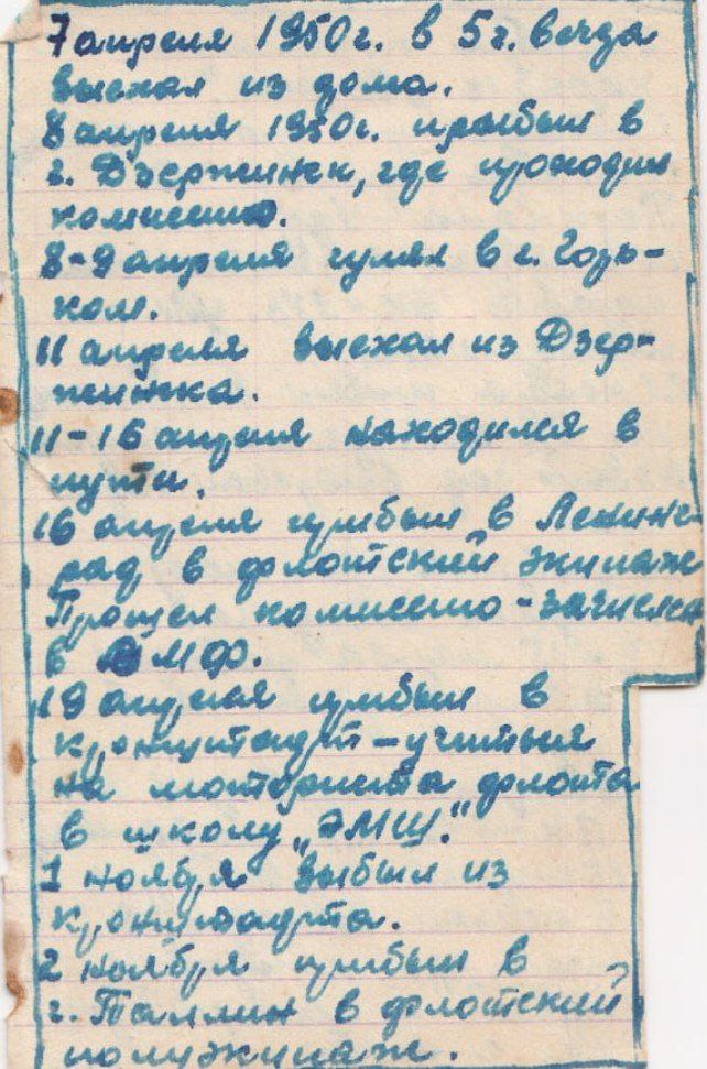 «7 апреля 1950 г. в 5 часов вечера выехал из дома. 8 апреля 1950 г. прибыл в Дзержинск, где проходил комиссию. 8–9 апреля гулял в Горьком. 16 апреля прибыл в Ленинград, во флотский экипаж. Прошёл комиссию – зачислен в ВМФ. 19 апреля прибыл в Кронштадт: учиться на моториста флота в школу ЭМШ», – пишет Анатолий.