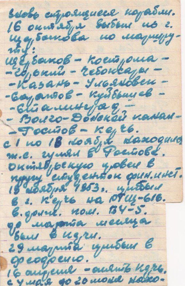 В записях также подробно описывается путь его отпуска. Направляясь домой, он путешествовал по разным городам: посетил Ленинград, Таллин, Ригу, Порккала-Удд, Кронштадт, Курессааре, Ростов, Керчь, Феодосию, Ялту, Балаклаву, Судак, Туапсе, Новороссийск и другие.