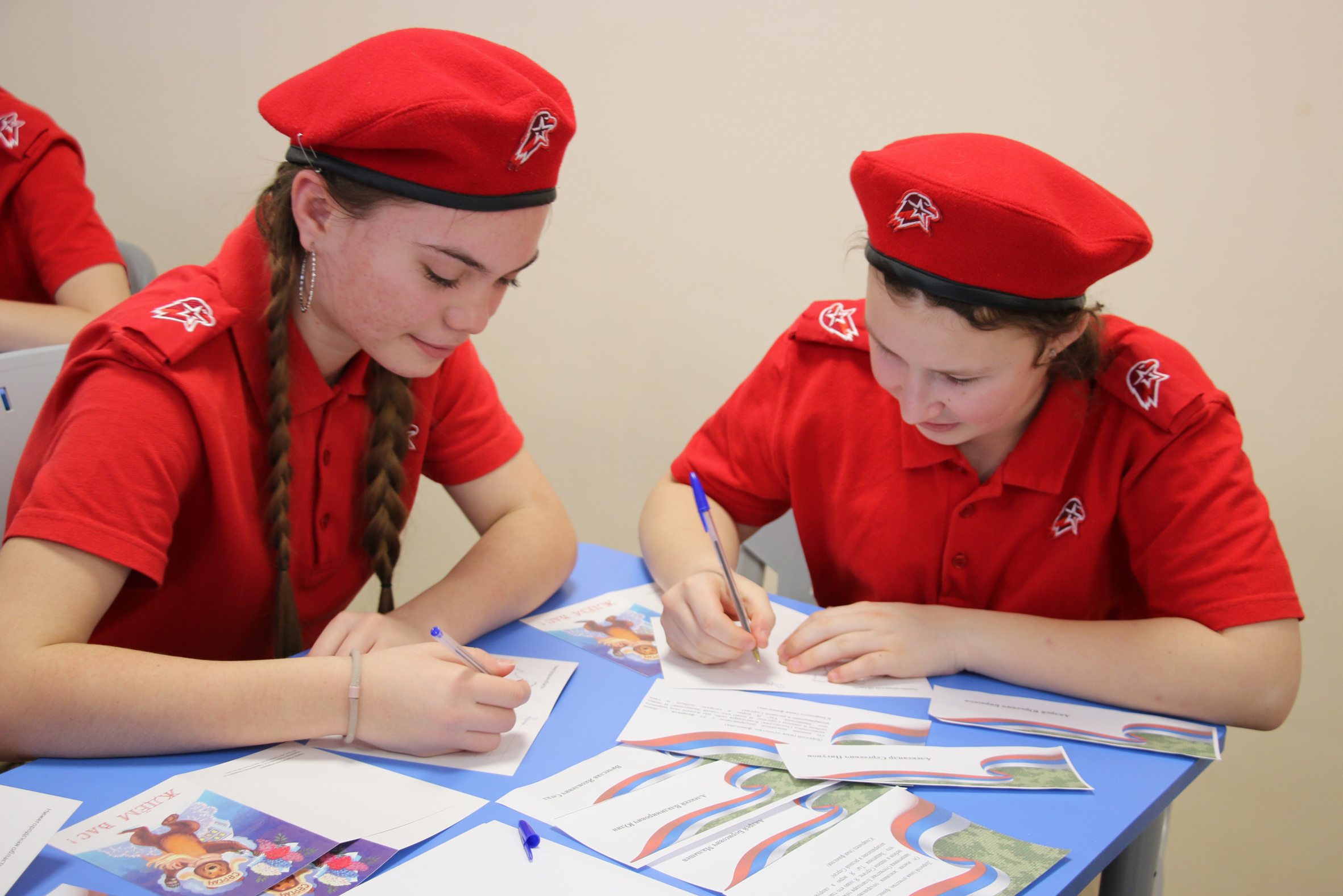 И вот самый трогательный момент патриотической акции: ребята пишут послания нашим землякам-защитникам на открытках с символом округа – медведем. Сосредоточенные и серьёзные лица, минутные раздумья – и вот первые строки уже на открытке. Не торопятся юнармейцы, обдумывают каждое слово, ведь они пишут на передовую, туда, где трудно: «… только ты можешь защитить Россию, солдат! Я горжусь тобой! Возвращайся живым и здоровым!»