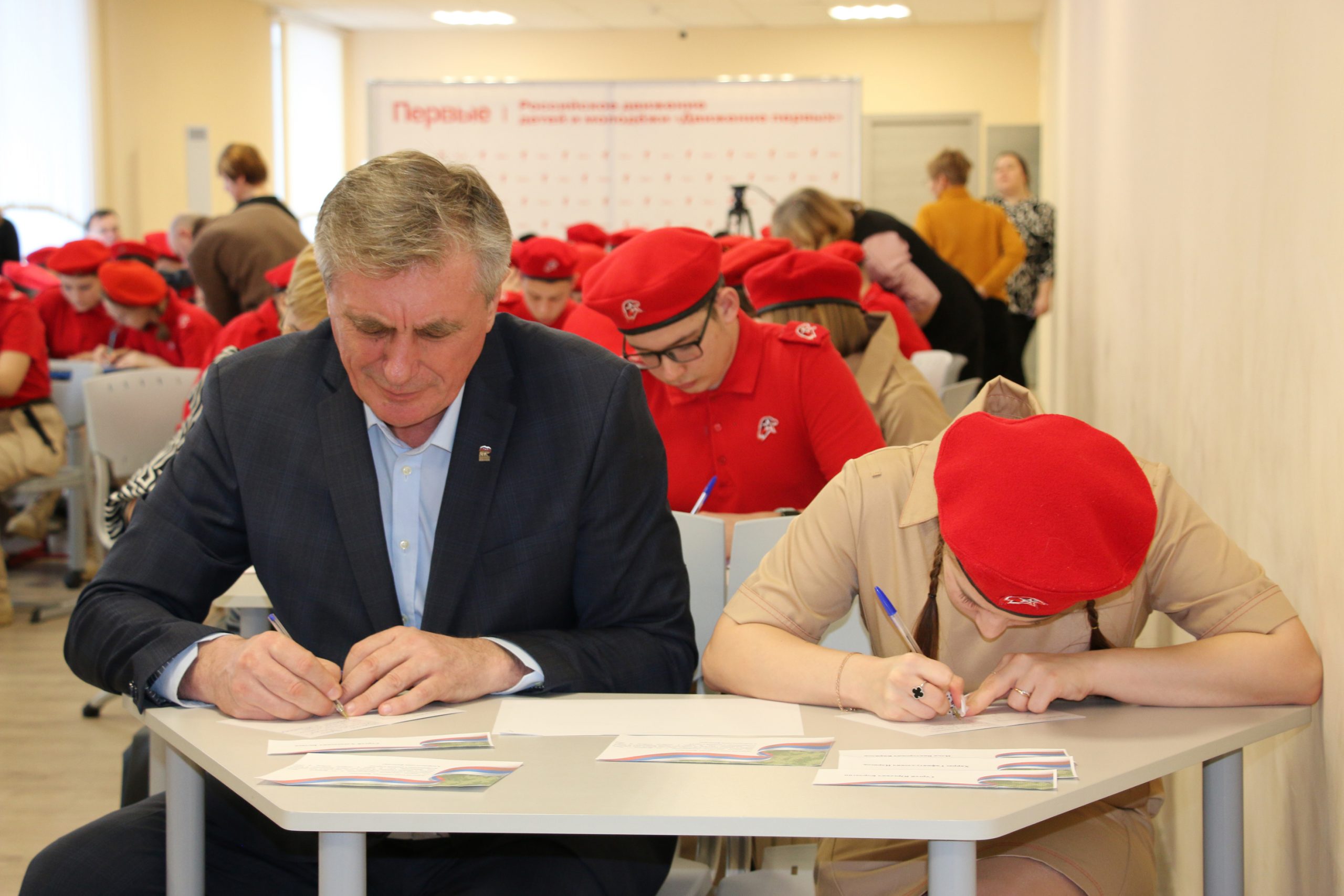 Четырнадцатого февраля в центре «Созвездие» состоялось патриотическое мероприятие, организованное администрацией округа, управлением образования, управлением культуры, искусства и туризма, где юнармейцы школ округа собрались, чтобы написать добрые, тёплые пожелания и поздравления с 23 февраля нашим защитникам, находящимся на СВО, именно на открытках с сергачским мишкой.