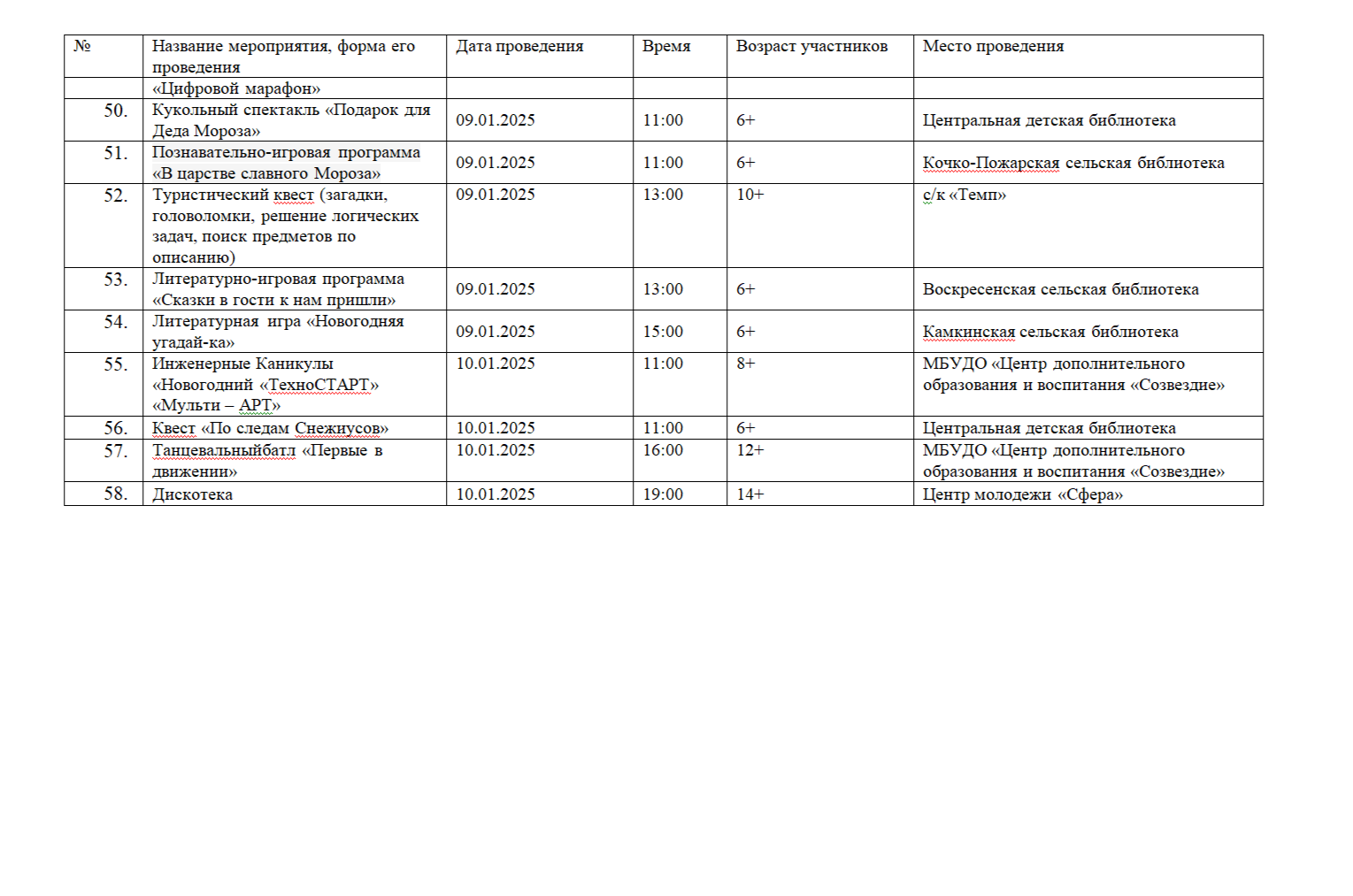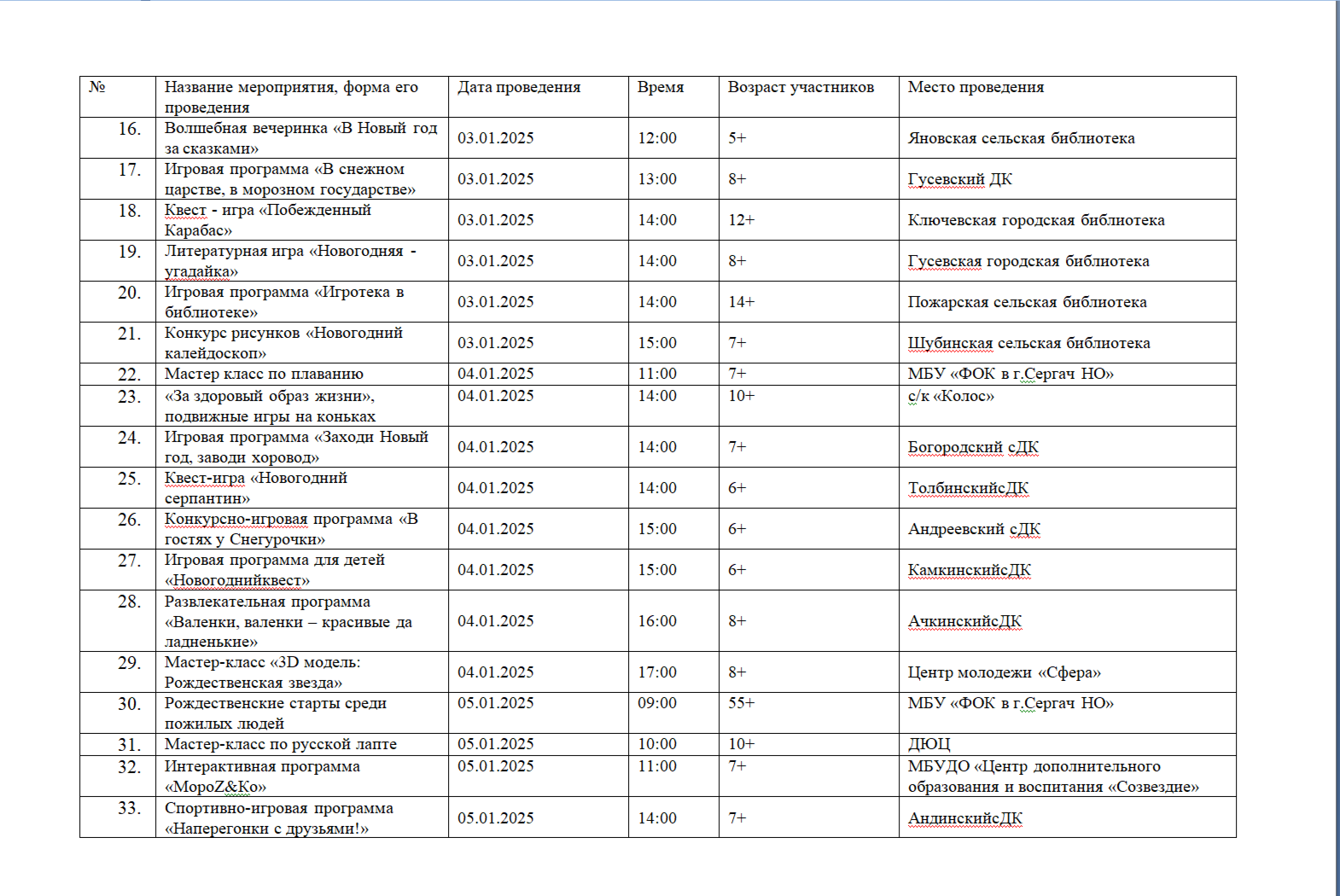 План мероприятий в новогодние праздники