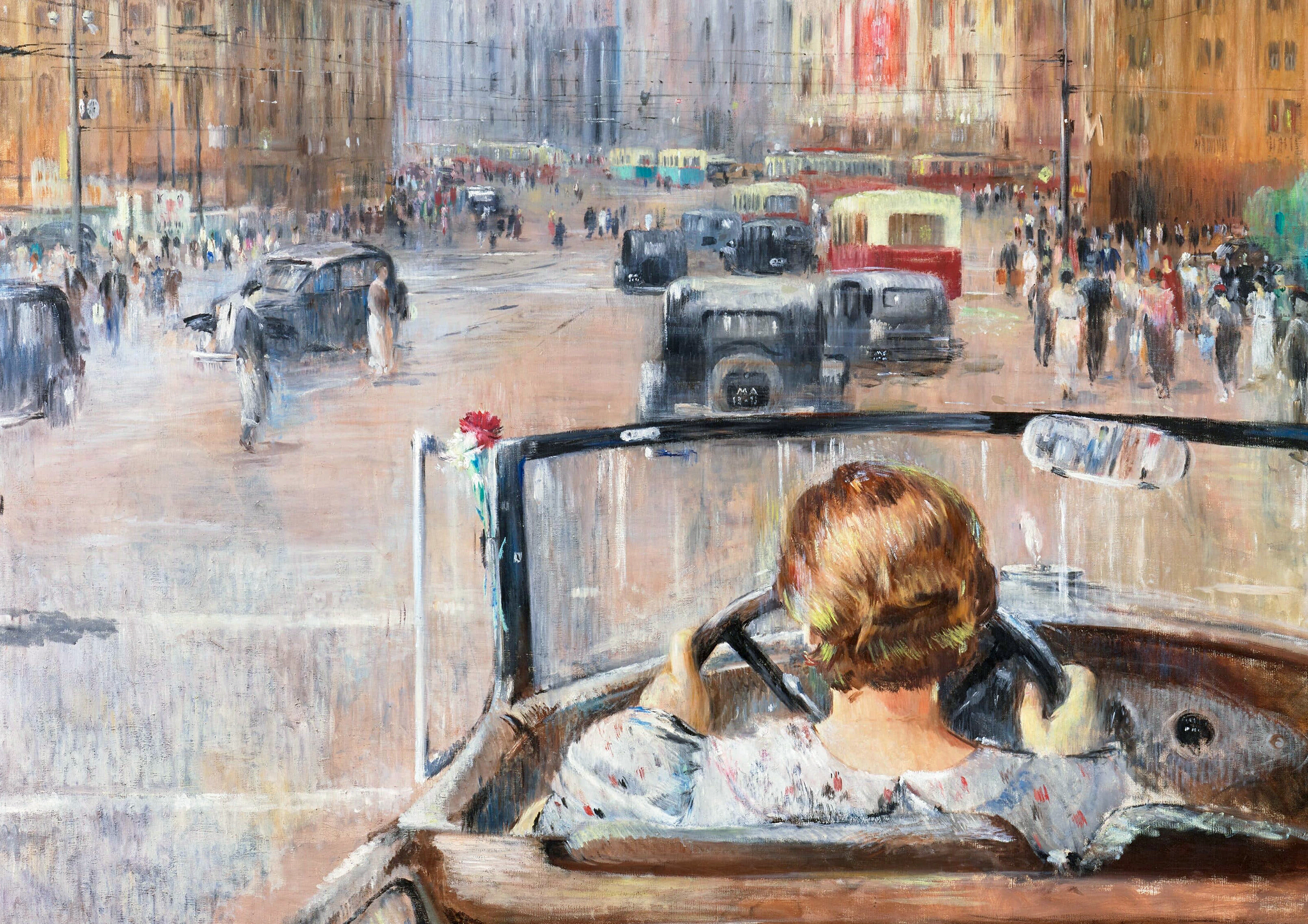 А что же женщина!? А она в приталенном платье с невероятной брошью, с изящной сумочкой в руке идёт на работу, где она не только воплощение красоты, а успешная сотрудница завода, магазина, школы, поликлиники, Дома культуры. Она водит машину и строит дома, сажает деревья и защищает научные труды, в красоте и изяществе, не теряя своей силы.